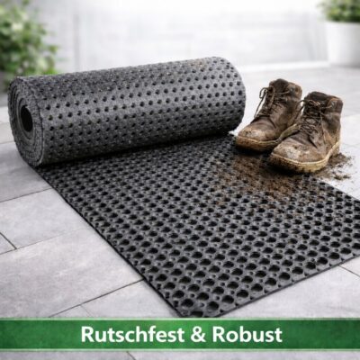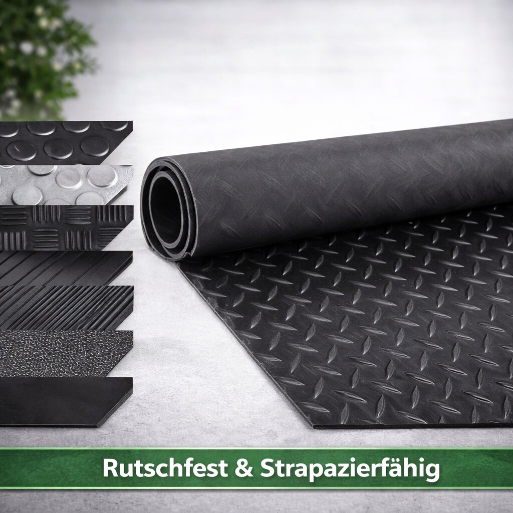 Gummimatten sind besonders strapazierfähig und vielseitig einsetzbar. Sie eignen sich sowohl für den Innen- als auch für den Außenbereich und sind UV-beständig sowie rutschhemmend. Unterschiedliche Oberflächenstrukturen wie Noppen, Riffel- oder Tränenblech sorgen für zusätzliche Trittsicherheit. Je nach Bedarf stehen zwei Materialvarianten zur Auswahl: Die TPE Gummimatte als Premium-Variante ist besonders geruchsneutral und hochwertig, während die SBR Gummimatte eine kostengünstige Alternative für den Außenbereich darstellt.