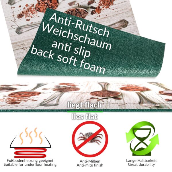Der Küchenläufer ist modern und pflegeleicht und macht ihn damit zum absoluten Allrounder im gesamten Haus. Egal ob im Flur, im Wohnzimmer oder im Bad, der Läufer ist nicht nur in der Küche einsetzbar. Er schützt den Boden und sorgt durch die rutschfeste Unterseite aus PVC-Weichschaum für ein hohes Maß an Sicherheit. Da der Küchenteppich keine Umkettelung hat, kann man ihn ganz einfach auch im Nachhinein noch an die Gegebenheiten vor Ort anpassen.  Das Obermaterial aus Polyester ist besonders robust und abriebfest, sodass auch bei frequentierter Nutzung der Küchenläufer Ihnen lange Freude bereitet.