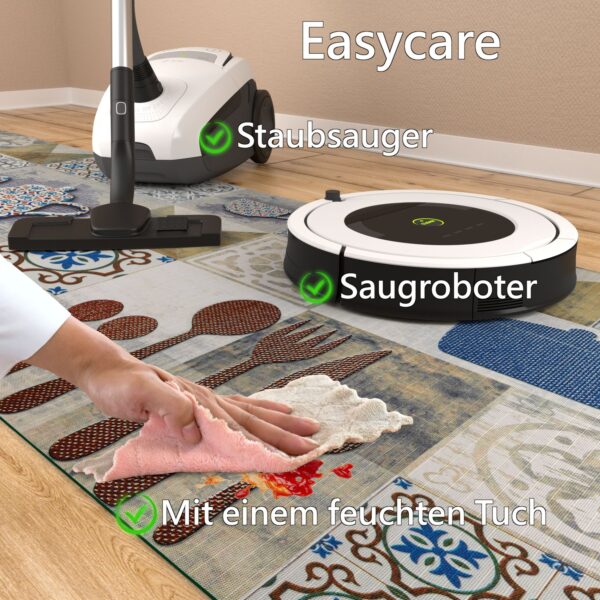 Bringen Sie frischen Schwung in Ihre Küche mit unserem modernen Küchenläufer! Die Oberseite besteht aus 100% Polyester und ist mit einem stilvollen Druck versehen, der jedem Raum eine ansprechende Note verleiht. Mit einer Höhe von nur 3 mm und einer Breite von 52 cm fügt sich der Läufer nahtlos in Ihre Küchengestaltung ein.Die granulierte PVC-Unterseite sorgt für eine rutschfeste Basis, die Ihnen Sicherheit und Stabilität beim Kochen und Arbeiten bietet. Dank seiner schmutz- und fleckabweisenden Eigenschaften ist der Küchenläufer äußerst pflegeleicht und kann bei Bedarf bis zu 40 °C in der Waschmaschine gereinigt werden. Darüber hinaus ist er zuschneidbar, sodass Sie ihn ganz einfach an Ihre Wunschgröße anpassen können – ganz ohne Ausfransen. Sein strapazierfähiges Material macht ihn multifunktional: Er ist nicht nur ideal für die Küche, sondern kann auch in anderen Wohnbereichen eingesetzt werden. Zudem ist der Küchenläufer für die Nutzung auf Fußbodenheizungen geeignet, was ihn zu einer vielseitigen und praktischen Wahl für Ihr Zuhause macht!