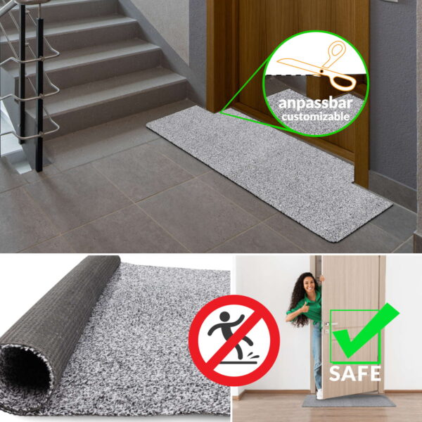 Mit einer Stärke von 4,5mm kann der 100cm breite Flur Teppich, der als Meterware verfügbar ist, vor Ort mit einem Cuttermesser an die Gegebenheiten angepasst werden. Der Schmutzfangteppich besteht in seiner Oberfläche aus 75% Zellulose, was eine besonders reißfeste und robuste Faser ist, die hier verarbeitet wurde. Die Unterseite aus Gummi-Waffelmuster ist besonders rutschfest und sorgt so im Eingangsbereich für ein besonderes Maß an Sicherheit. Der Flur Teppich kann jedoch nicht nur als Teppich Läufer Flur, oder Schmutzfangmatte vor der Türe eingesetzt werden, auch als Küchenläufer oder im Keller oder der Garage bietet der Teppichläufer durch sein gutes Preis-Leistungs-Verhältnis einen tollen Bodenschutz.