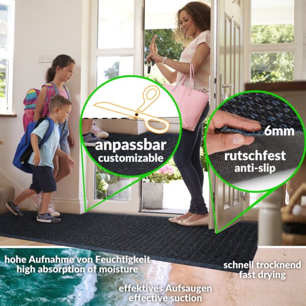 Die Schmutzfangmatte ist vielseitig einsetzbar. So kann sie sowohl als Sauberlaufmatte vor der Haustüre eingesetzt werden, oder als Flur Teppich. Durch die noppenartige Oberfläche reinigt er Schuhsohlen besonders gut von Verschmutzungen, sodass diese nicht durch den gesamten Wohnraum getragen werden. Die Unterseite aus rutschfestem Gummigranulat sorgt für das besondere Maß an Sicherheit, was besonders in Eingangsbereichen von großer Wichtigkeit ist.